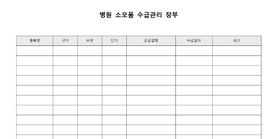 의료 현장에서 필요한 다양한 소모품의 입고부터 사용까지 상세히 기록 관리하며 정확한 재고와 소비 현황을 즉각적으로 파악할 수 있는 병원 관리 양식으로 품목명, 공급업체, 수급일자로 구